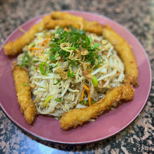 Hähnchen in Tempurateig, erfrischender Glasnudelsalat mit Mango, Gurke, Koriander, Salat, Erdnüsse, Röstzwiebeln, Knoblauch Chili Dressing